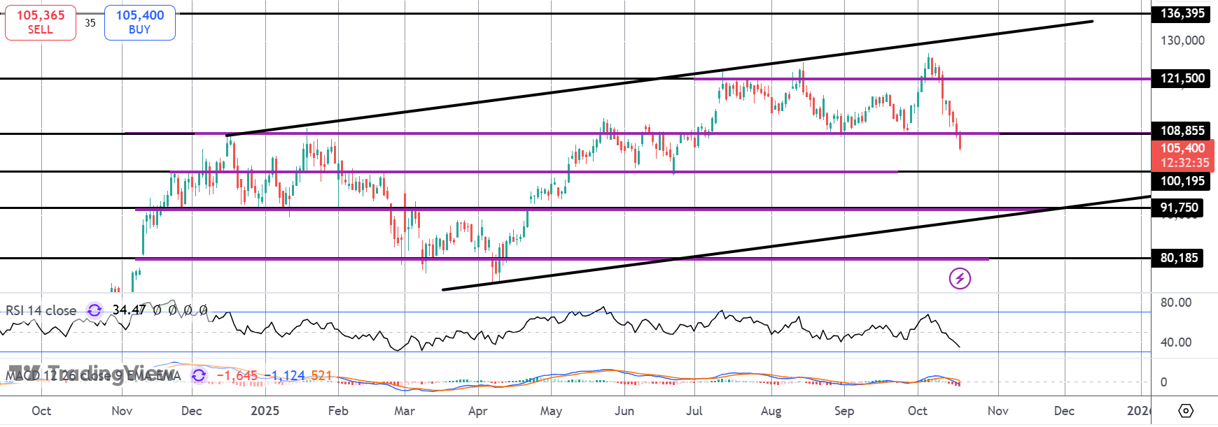 The reversal lower in Bitcoin is gathering pace now with price breaking below the $108,855 level. Focus is now on the upcoming $100k mark. This is a key psychological level for the market and a break lower could open the way to a much fuller reversal with $91,750 and the bull channel lows the next support to note.